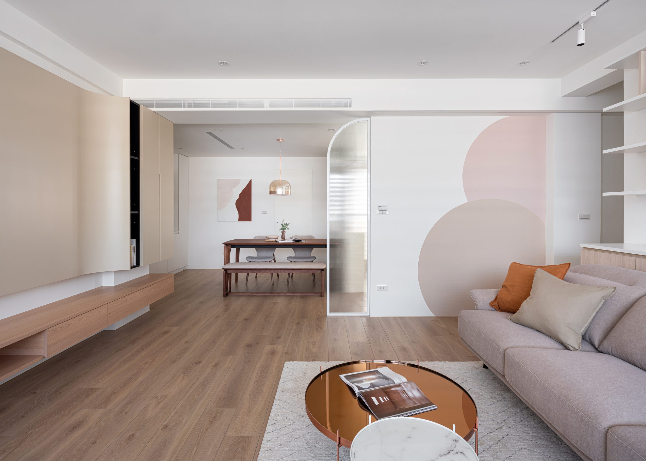 使用材質|木皮、半圓格柵造型板、霧面玻璃、柔紗簾